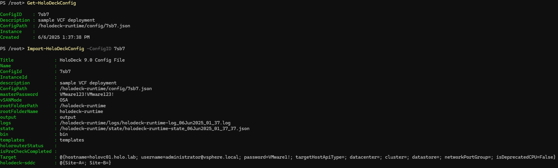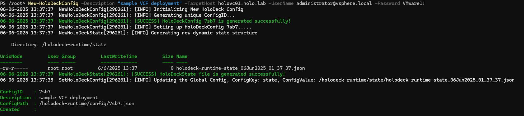 Centralized Configuration: Holodeck 9.0 has been designed around the concept of a centralized config file that acts as the source of truth for nested VCF deployments. The config file is a JSON file with a set of templates that are needed to run Holodeck. Customers are not expected to interact with the config file directly or edit it. We have built powershell cmdlets that help create, edit or import the config file as needed. The default template for config file is stored in /holodeck-runtime/templates/config.json. This config.json file is replicated and placed in /holodeck-runtime/config/<config-ID>.json when a new holodeck config is created using the cmdlet New-HoloDeckConfig.