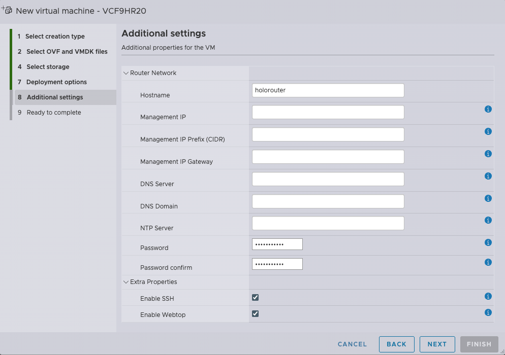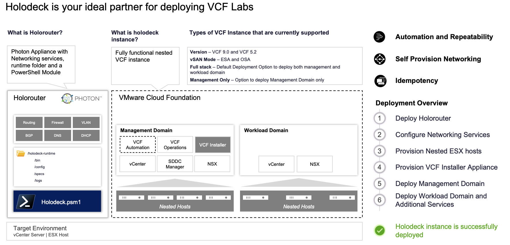 Holodeck 9.0 supports nested VCF deployment for versions 5.2 and 9.0. This can be deployed either on a single stand-alone ESX host or a vSphere cluster based on resource availability. Please check the Pre-requisites section