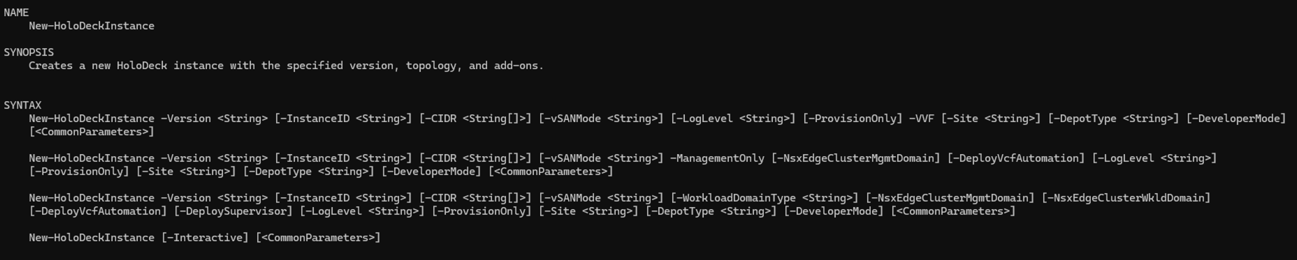 New-HoloDeckESXiNodes -Nodes <No. of Nodes> -CPU <No. of vCPU> -MemoryInGb <Memory in GB> -Site <'a' or 'b'> -vSANMode <'ESA' or 'OSA'>