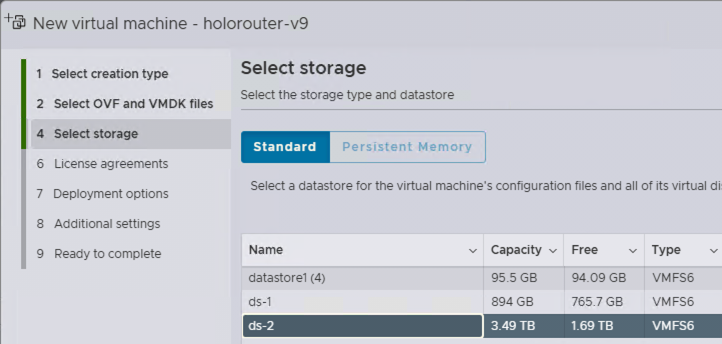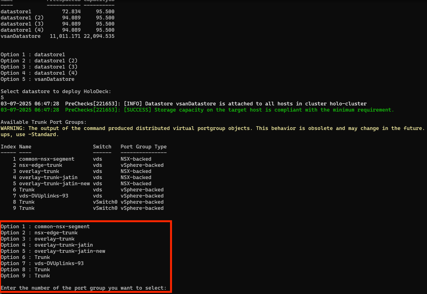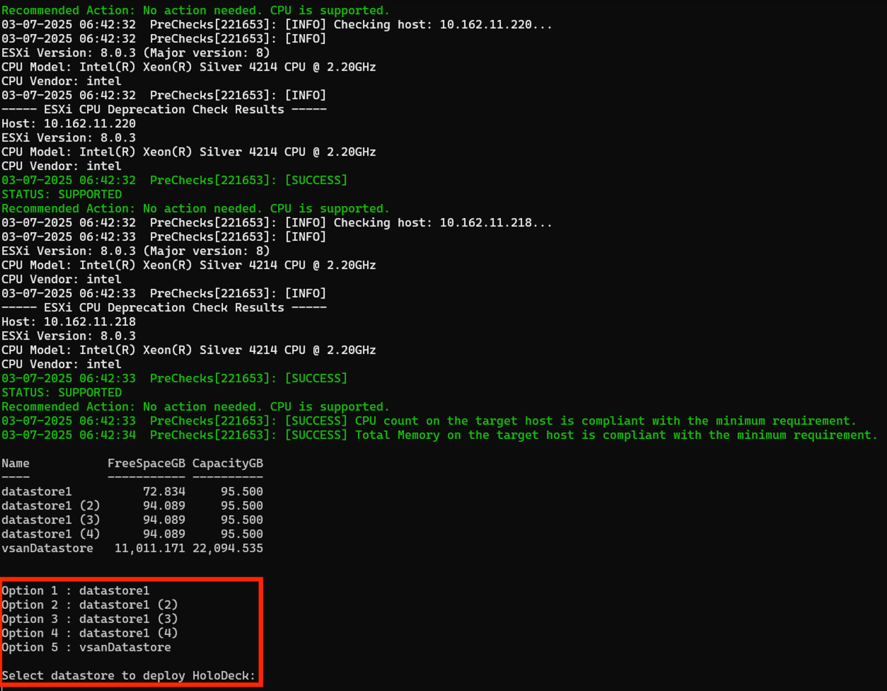 This is an interactive section during the pre-checks where you select the desired datastore to use for Holodeck deployment: