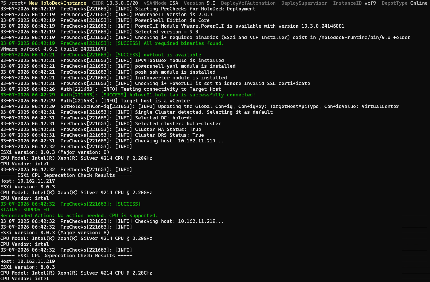 Built-In PreChecks: Holodeck 9.0 runs a set of pre-checks when a new deployment is run to ensure everything needed is available such as all the required binaries are available in the right location or not, is the target host reachable etc.