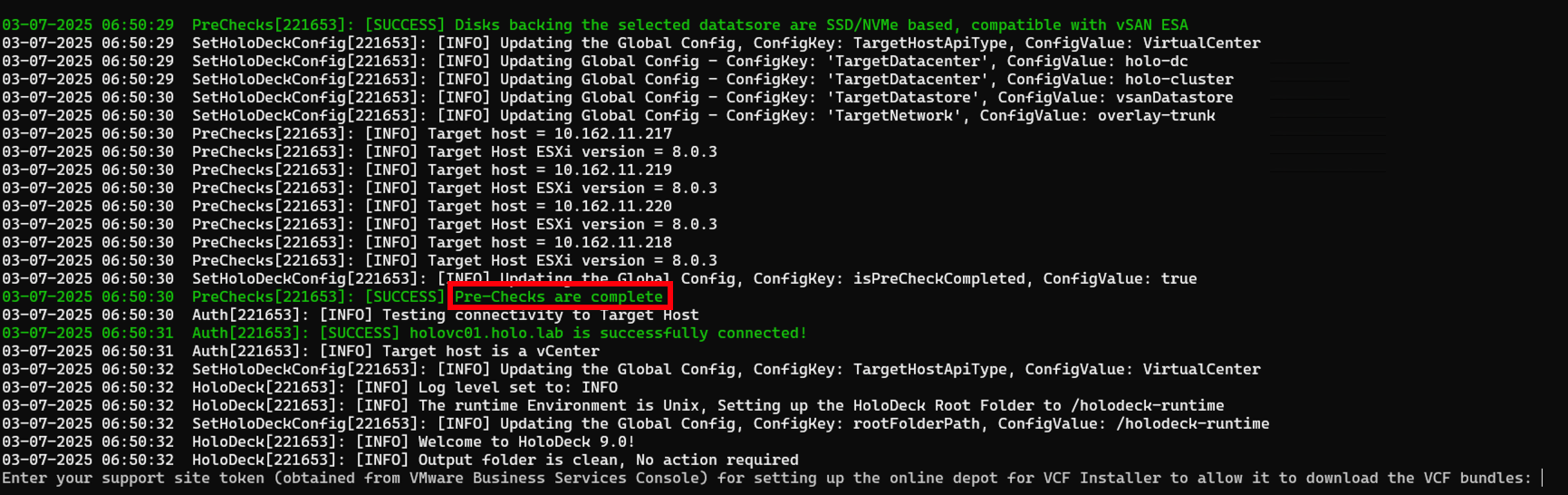Pre-Checks are completed. If going through the online route, you need to provide the broadcom support site token: