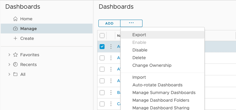 Manageon theVisualize→Dashboardspage. Select the dashboard, click the...button, and selectExport.